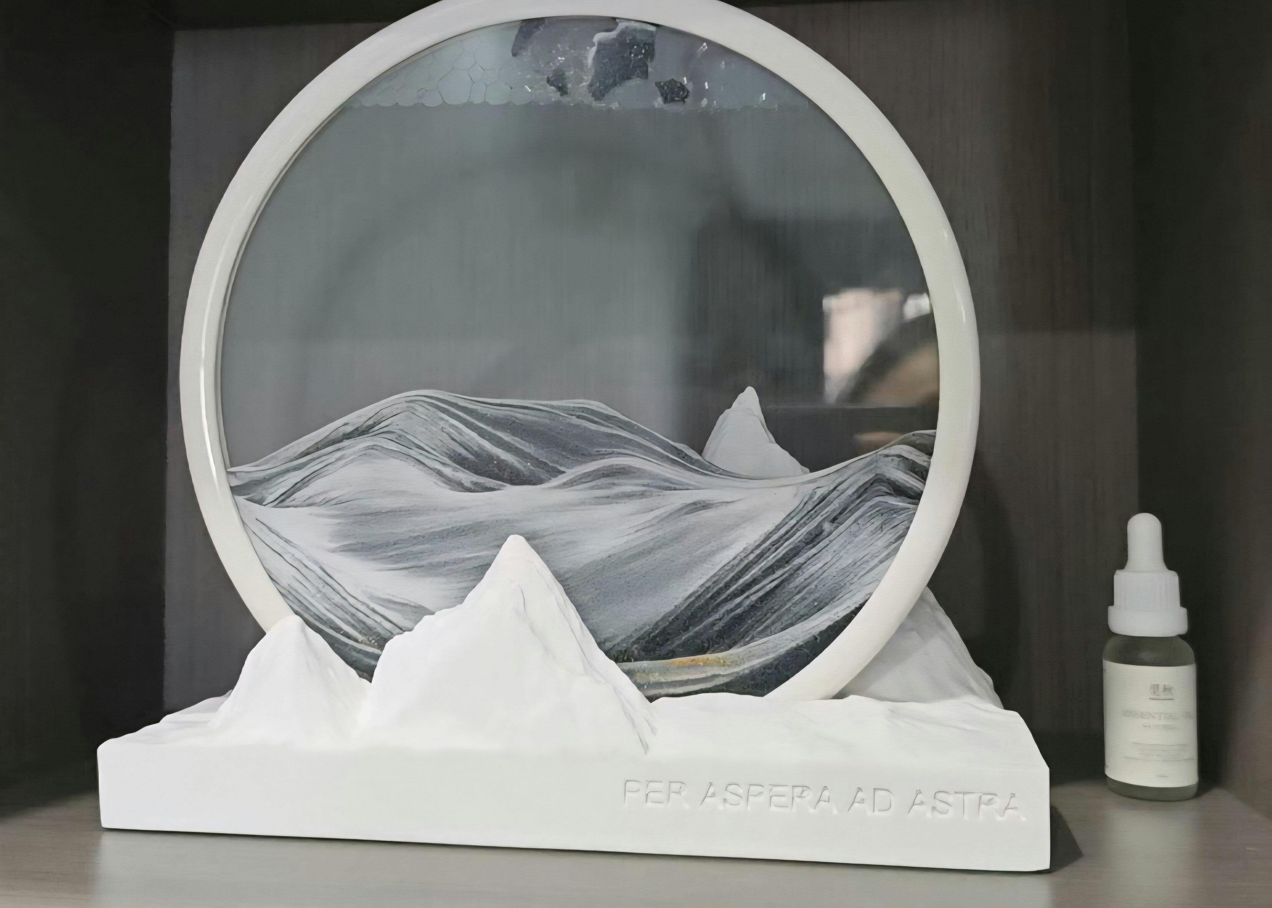 Each piece combines flowing sand landscapes with mountain-inspired aromatherapy, creating an ever-changing masterpiece that soothes the senses.