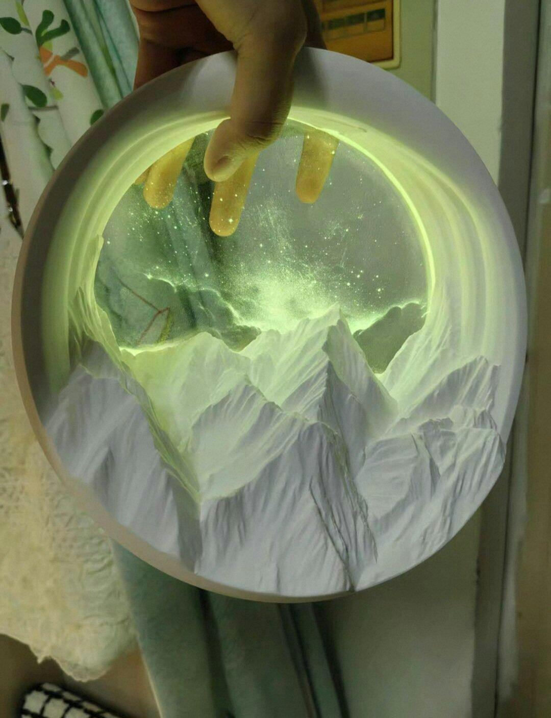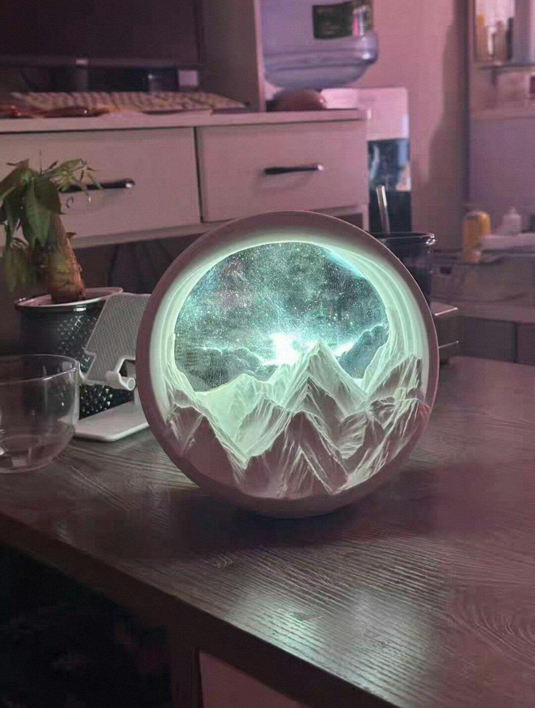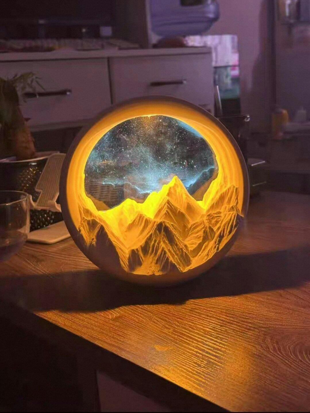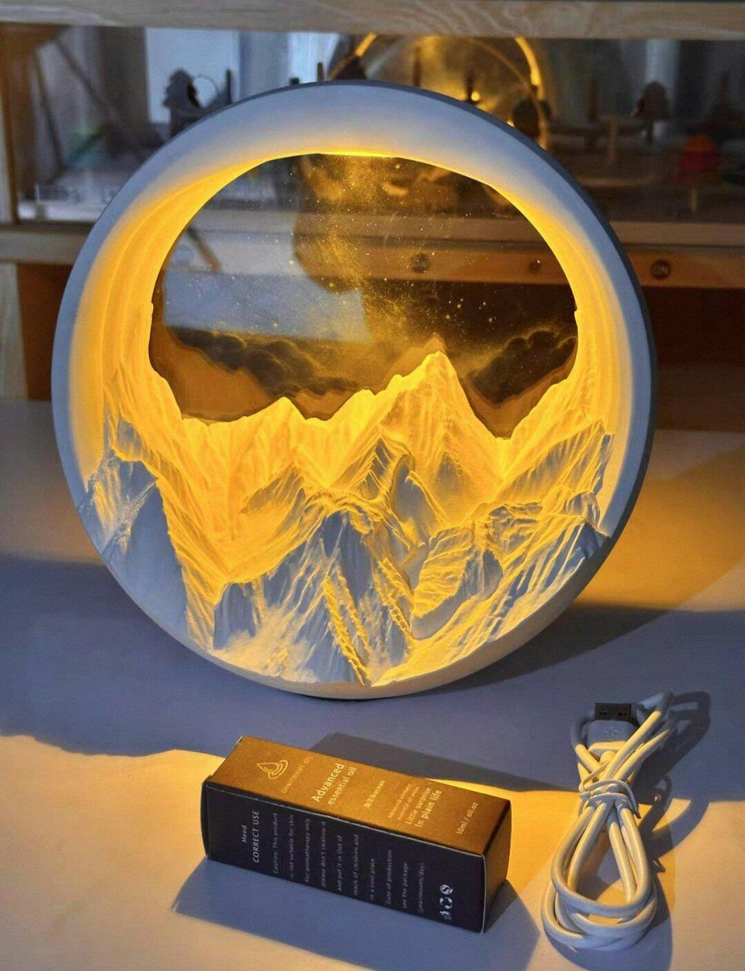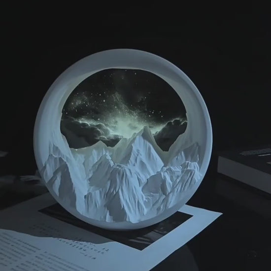 The Moonlit Galaxy™ Aromatherapy Night Light combines a sculpted snow-capped mountain landscape with soft LED lighting and soothing essential oils, creating a calming atmosphere perfect for bedrooms, living rooms, or as a unique gift.
