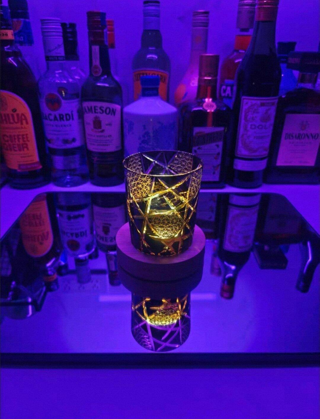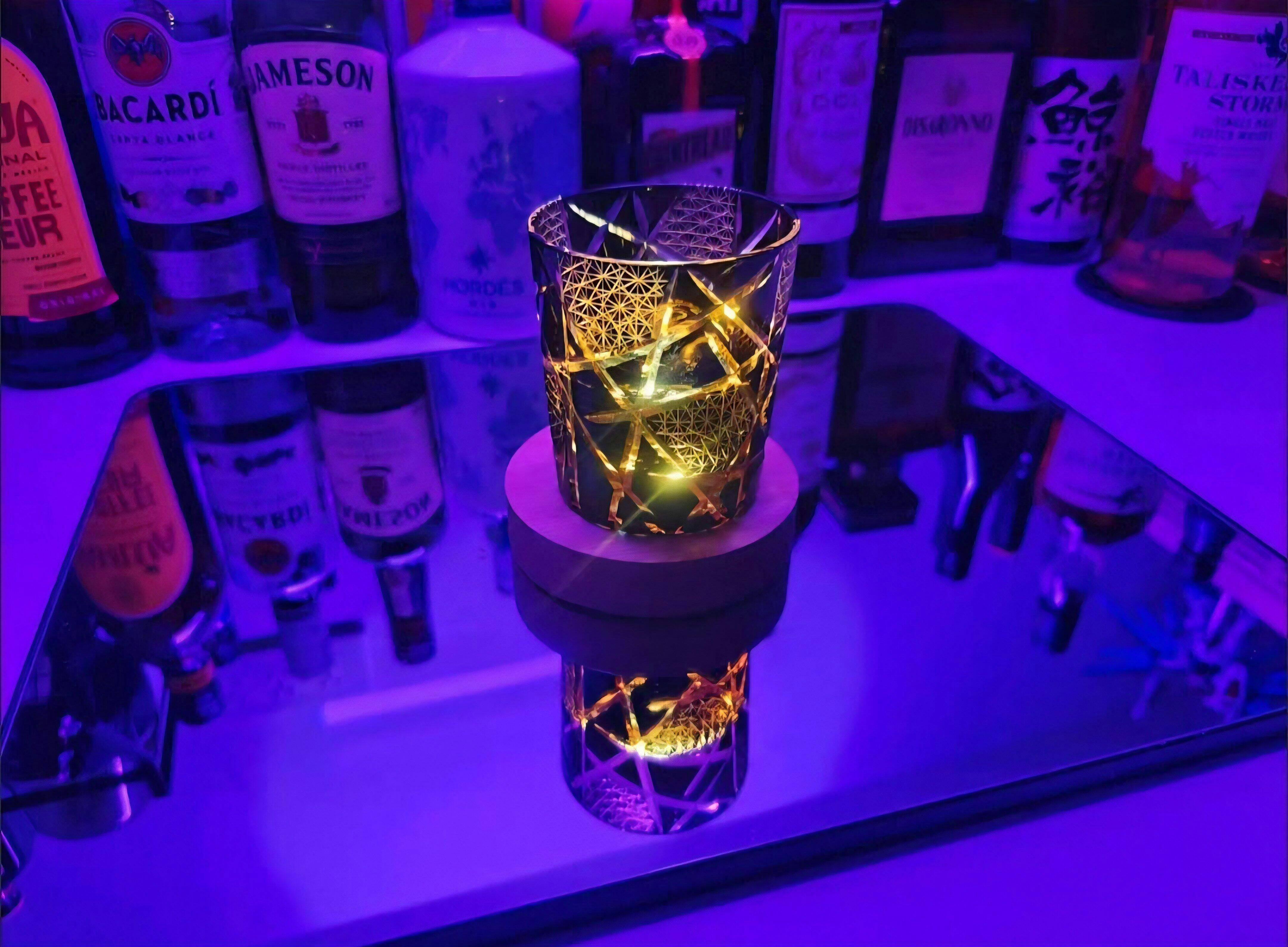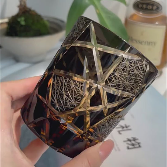 Each glass is hand-carved from premium crystal, blending the traditional Edo Kiriko technique with a modern lightning-inspired design. The deep amber-black body glows with golden brilliance under light, casting mesmerizing shadows across any surface.